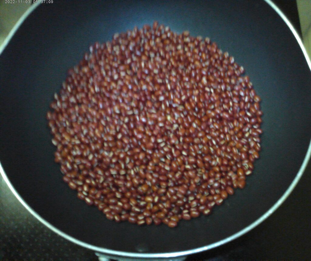 200gのあずきを軽く水洗いを行い、フライパン等にあずきを入れ水が被るくらい入れ2~3分茹でます。
