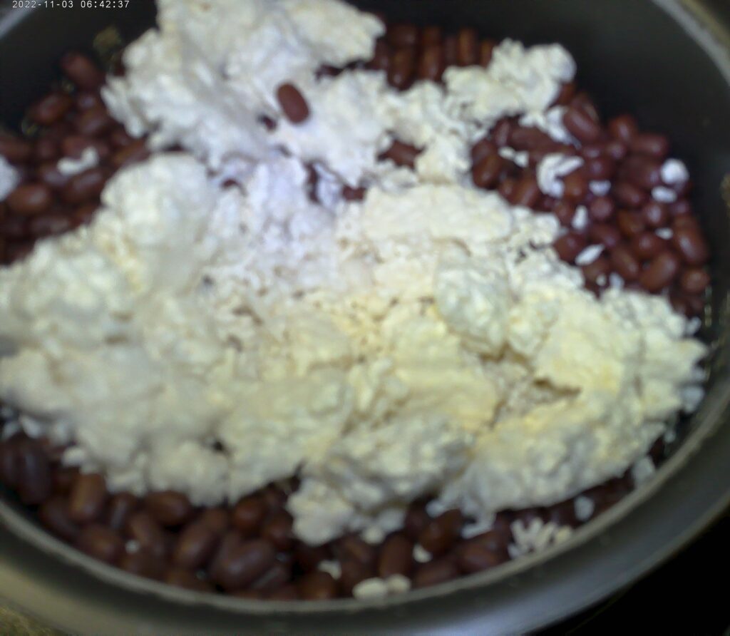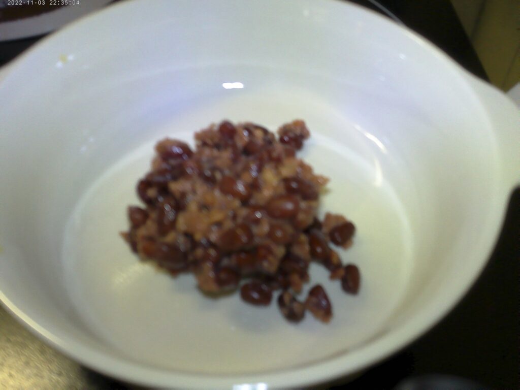 茹で上がったら煮汁とあずきに分けます。60℃まで冷めさせてから、炊飯器にあずきを入れ、米麹200gと一つまみの塩を入れ保温(60℃)モードで8時間かけ調理します。
